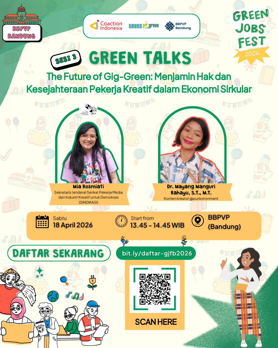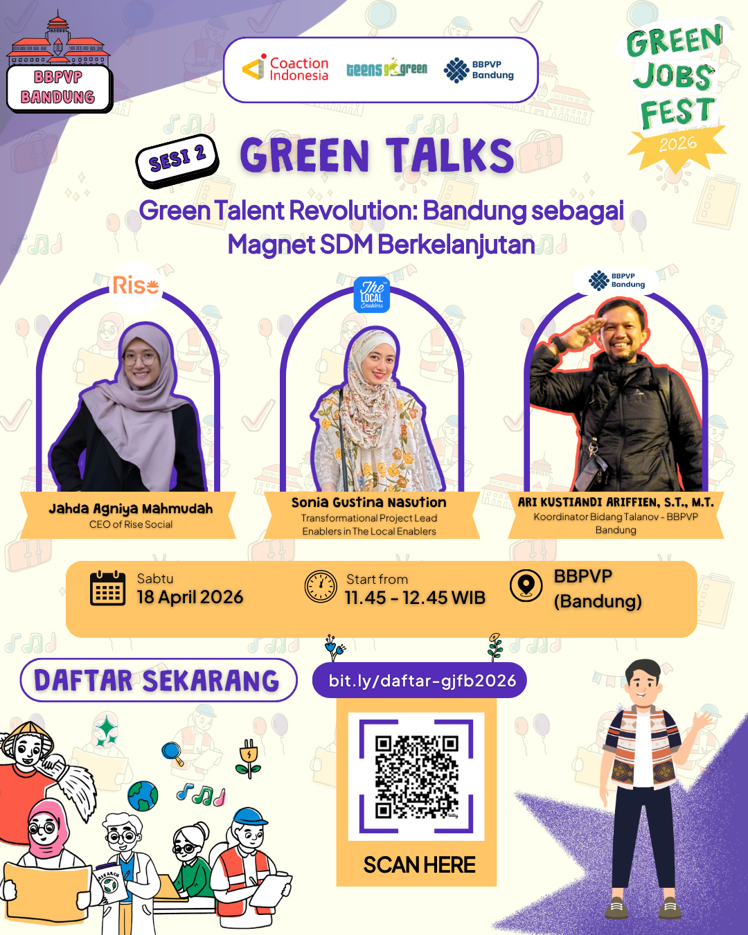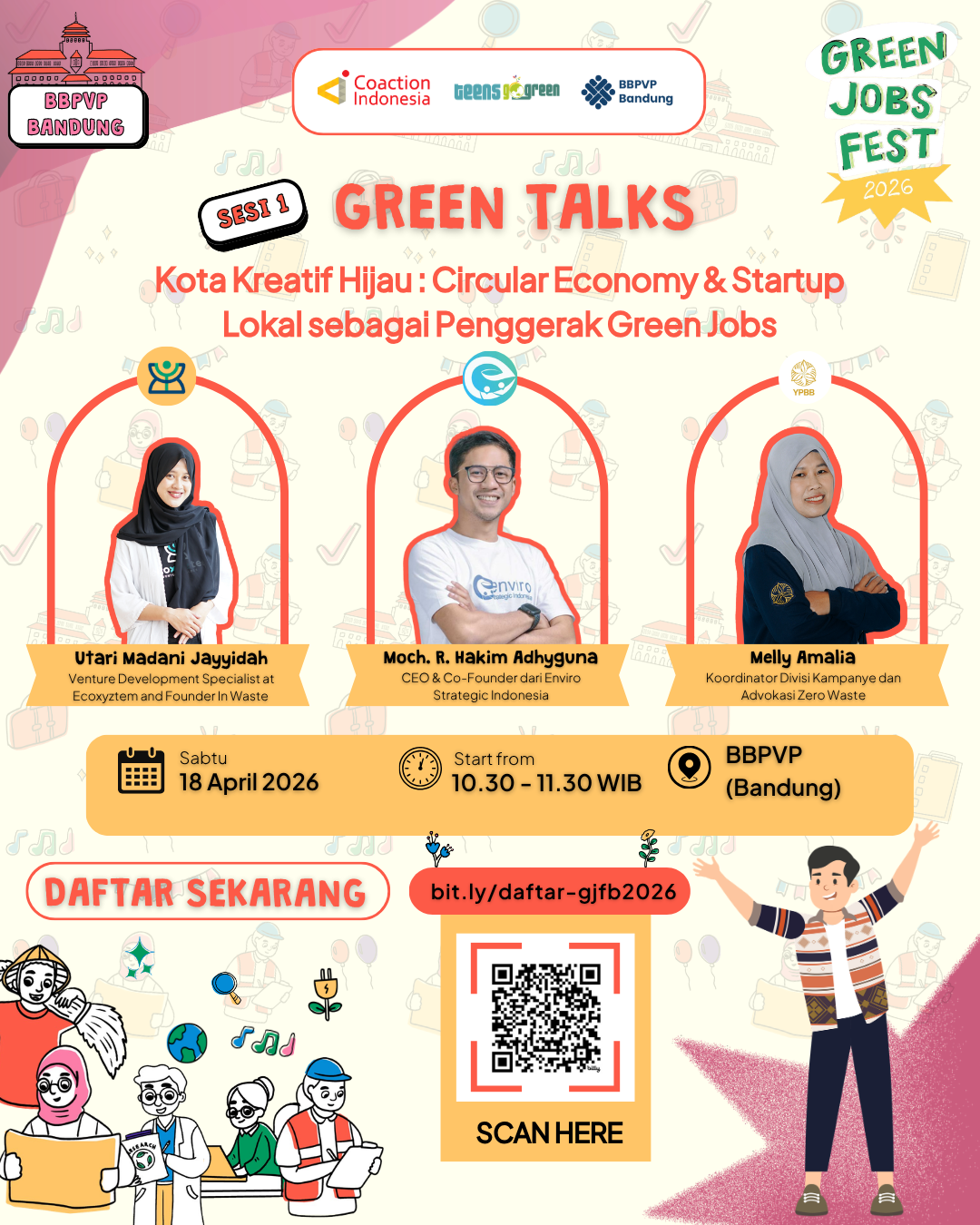 Buat kamu yang mau mengenal Green Jobs atau mulai langkah awal, Green Jobs Fest Bandung 2026 adalah jawabannya. Dari Green Talks hingga Art Performance, kita akan membangun ekosistem karier yang nggak cuma bikin kamu kompetitif, tapi juga peduli pada bumi.